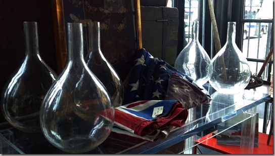 Actually, I am not 100% sure if that’s the name of the shop we visited, because they gave us a card that had that, and Cafiero Select written on it. But since Grey Gardens is a much better name, I am going with that. Oh, the shop only opened a few days before we went there, so I will cut them some slack about not having the name anywhere on the outside. If I had a shop, this is what I would like it to be. Quirky, interesting and fun. Grey Gardens was filled with unusual objects, like these large glass bottles from a chemistry lab, and the old American and British flags.