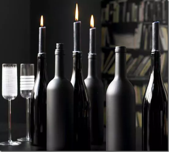 Wine bottles spray-painted matte and gloss black, with black candles.